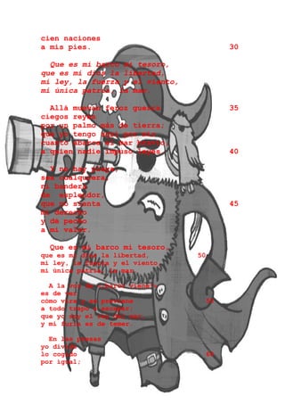 El documento es un poema que narra la vida de un capitán pirata. En tres estrofas, el poema describe al pirata cantando orgullosamente sobre sus hazañas de saquear 20 barcos enemigos, desafiando a los reyes y reclamando los mares como su patria y fuente de libertad.