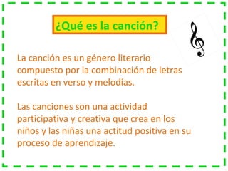 El documento define la canción como una combinación de letras escritas en verso y melodías musicales. Explica que las canciones tienen características como la unidad, brevedad y narrativa, y menciona tipos como artísticas, folclóricas y populares. Además, describe las partes comunes de una canción popular como estrofas, estribillo y puente musical.