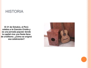 El documento habla sobre la celebración de la Canción Criolla en Perú el 31 de octubre. Describe brevemente que es una fiesta popular en la capital que rinde homenaje a la cultura criolla del país a través de su música, comida y tradiciones.