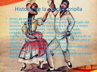 Este documento describe la historia de la canción criolla en Perú. Explica que la palabra "criollo" originalmente se refería a esclavos nacidos en las colonias, pero luego se aplicó a los blancos y mestizos nacidos en América. El sentimiento de identidad criolla dio origen al movimiento de independencia en Perú. El vals criollo se derivó del vals vienés pero adquirió un sabor especial debido a la influencia de géneros como la jota y el tango. En 1944, el presidente Manuel Prado