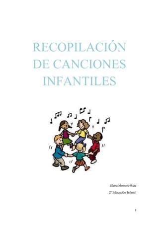 Este documento presenta una recopilación de canciones infantiles organizadas en diferentes secciones: canciones sobre el cuerpo, animales, objetos cotidianos e historias. Incluye canciones populares como "Mi cuerpo", "La vaca lechera" y "La gallina pintadita", con letras sencillas y ritmos adecuados para niños pequeños. El objetivo es proporcionar material para trabajar la música y el lenguaje en educación infantil.
