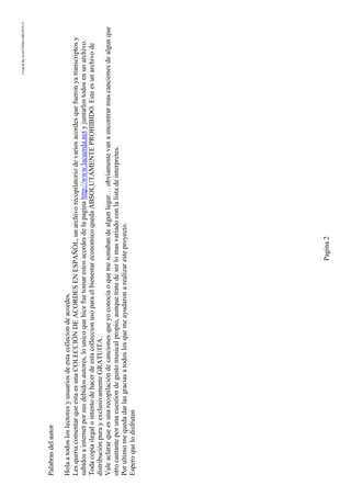 Este documento es una recopilación de acordes musicales de varios artistas realizada por El MUNDO CABEZÓN. Incluye las palabras del autor presentando la colección y agradeciendo a quienes lo ayudaron. También contiene un índice alfabético de artistas y listas de acordes de canciones de Los Abuelos de la Nada, Alejandro Lerner y otros intérpretes. El objetivo es distribuir este archivo de forma gratuita.