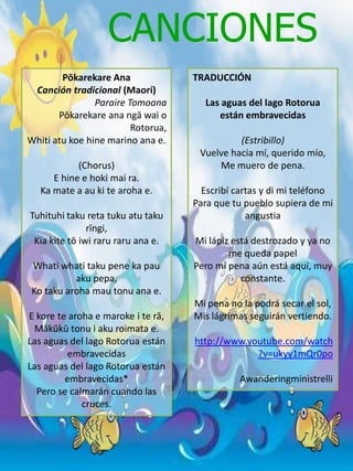 Este documento presenta información sobre la canción tradicional maorí "Pōkarekare Ana" y su traducción. También incluye detalles sobre el Haka de los All Blacks de Nueva Zelanda, incluida su letra en maorí y su traducción al español. Explica brevemente el significado y el propósito del Haka de representar valentía y perseverancia.