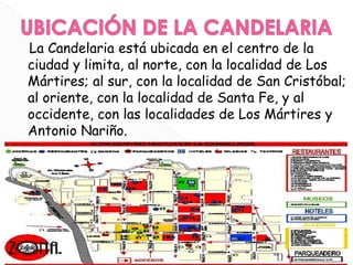 La localidad de La Candelaria se encuentra en el centro de Bogotá. Es la localidad más pequeña pero también la más importante históricamente, ya que fue donde se fundó la ciudad y el país. Contiene numerosos sitios históricos y culturales como la Plaza de Bolívar. Si bien sufre problemas ambientales como la contaminación, es importante dar a conocer su patrimonio al mundo para incentivar el turismo.