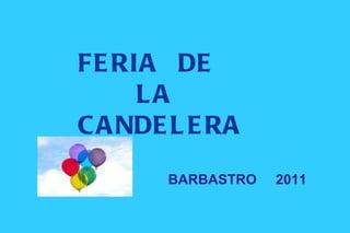 La Feria de la Candelaria se celebra en Barbastro cada 2 de febrero desde 1513, cuando la reina Germana de Foix decretó que tendría lugar en el centro de la ciudad y contaría con velas, máscaras, bufones, músicos y artesanos. Durante la mañana se realiza una misa donde se bendicen las velas y la gente pasea por las calles viendo puestos y comprando artículos como quesos, pan, embutidos, plantas, joyería y cerámica. A pesar de la lluvia, la fer
