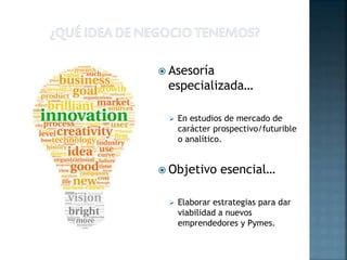 Este documento propone la creación de un servicio de asesoría especializada para nuevos emprendedores y pymes. El objetivo es elaborar estrategias que brinden viabilidad a estos negocios mediante el uso combinado de técnicas cualitativas como redes de retroalimentación entre expertos y cuantitativas como análisis de big data.