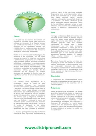Este documento describe la candidiasis, una infección causada por el hongo Candida albicans. Explica que la candidiasis es una de las enfermedades más comunes que afecta a los humanos y puede manifestarse de forma cutánea o mucocutánea. Enumera varios factores de riesgo como la edad, el embarazo, las enfermedades crónicas o el uso de antibióticos. Describe los principales síntomas de la candidiasis mucocutánea y cutánea. Finalmente, detalla los diferentes tipos de candidiasis