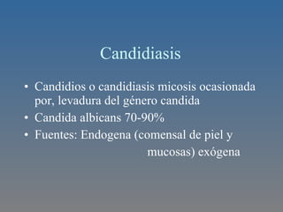 La candidiasis es una infección causada por la levadura Candida, que puede afectar la piel, mucosas, uñas y tejidos profundos. Los síntomas incluyen placas blanquecinas y enrojecimiento en la boca, vagina e intertrigos. Se diagnostica mediante examen directo y cultivo, y se trata modificando factores de riesgo y con antifúngicos tópicos y sistémicos como nistatina, miconazol, itraconazol o fluconazol.
