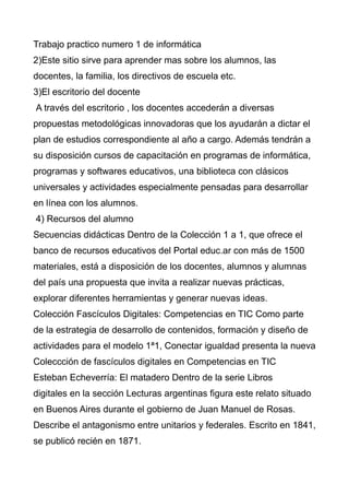 Este documento describe los recursos disponibles en el escritorio del docente y del alumno. El escritorio del docente incluye secuencias didácticas, actividades, una biblioteca, cursos y programas educativos. El escritorio del alumno incluye fascículos digitales sobre competencias TIC, libros digitales y juegos educativos. También describe los recursos que pueden descargarse como galerías de fotos y videos.