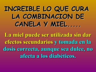 INCREIBLE LO QUECURA LA COMBINACION DE CANELA Y MIEL..... La miel puede ser utilizada sin dar efectos secundarios y tomada en la dosis correcta, aunque sea dulce, no afecta a los diabéticos.