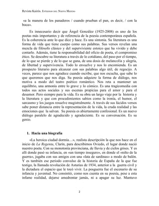 Este ensayo analiza la vida y obra del poeta español Ángel González. Se divide en tres partes: 1) una biografía que describe su infancia en Asturias durante la guerra civil y su carrera como profesor universitario, 2) un análisis de su poética y las influencias de poetas como Juan Ramón Jiménez, Antonio Machado y Luis Cernuda, 3) un estudio de su obra poética que expresa ideas sobre el compromiso social y la historia de España a través de un lenguaje sencillo. El ensayo proporciona