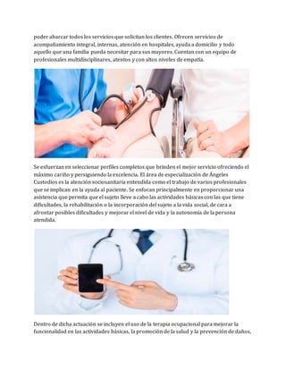 Isabel Martín es una empresaria de Madrid que trabaja en Ángeles Custodios, una empresa con más de 20 años de experiencia en el cuidado de personas mayores y otros servicios asistenciales. Su equipo multidisciplinario proporciona atención sanitaria a domicilio, rehabilitación y apoyo psicológico, buscando mejorar la calidad de vida de sus pacientes mientras se respeta su dignidad y rutinas. La empresa opera principalmente en la Comunidad de Madrid y se esfuerza por ofrecer un servicio de excelencia adaptado a las necesidades individuales de cada cliente.