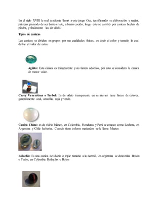 Este documento describe el origen y la historia del juego de las canicas, incluidos los diferentes tipos de canicas, los nombres del juego en diferentes países, las modalidades y reglas de varios juegos comunes con canicas. También incluye entrevistas con dos personas sobre sus experiencias con este juego tradicional de la infancia y una reflexión sobre la importancia del juego libre en el desarrollo de los niños.
