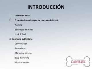 Este documento presenta una propuesta de estrategia de marketing para una empresa dedicada a la venta de productos y servicios de lujo para mascotas. La estrategia incluye el desarrollo de una imagen de marca sólida, una presencia en redes sociales y buscadores, y la generación de contenido para atraer a clientes potenciales y aumentar la visibilidad de la marca.