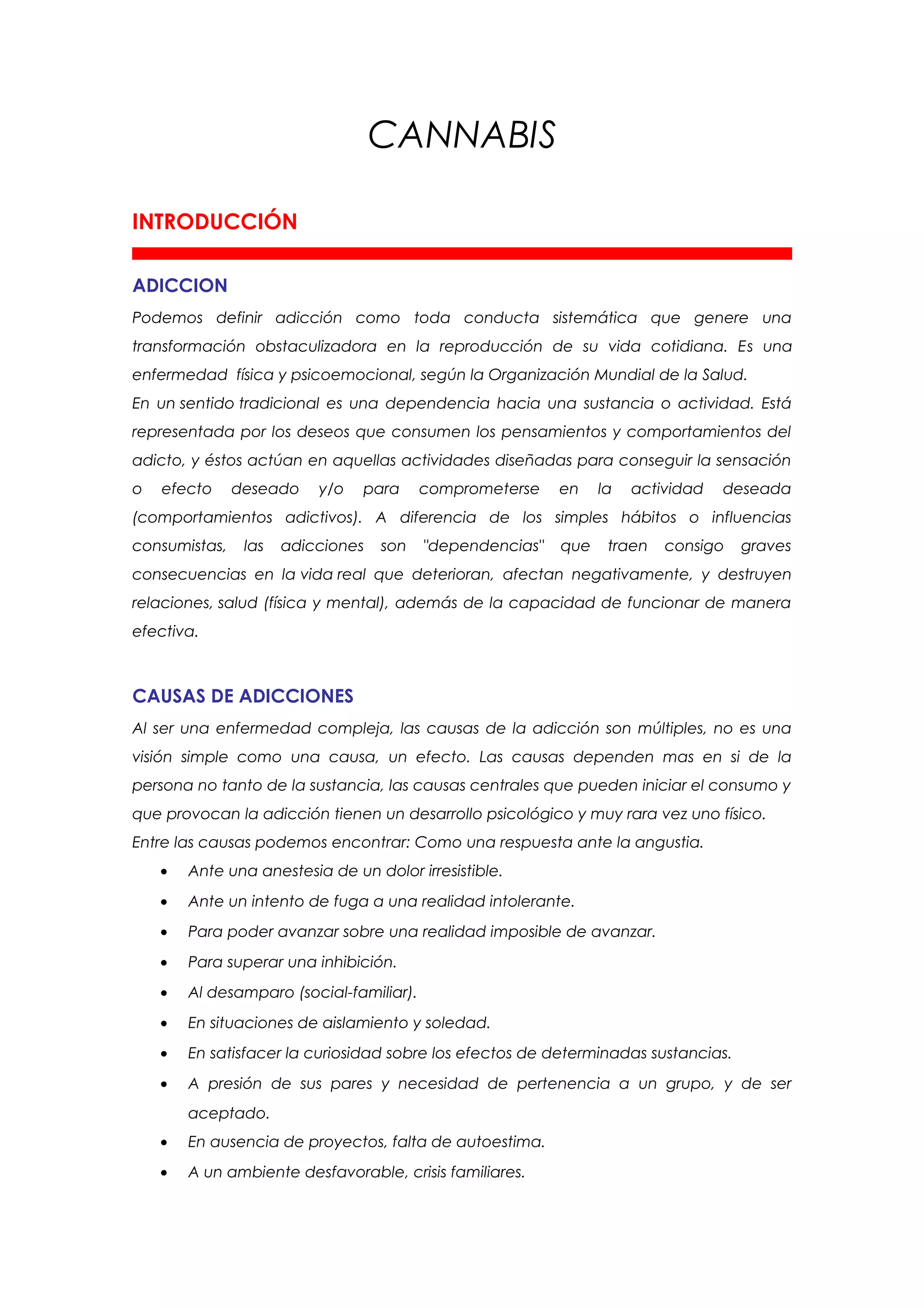 El documento trata sobre la adicción a la cannabis. Explica que la cannabis es una planta que contiene sustancias psicoactivas como el THC. Su consumo se ha extendido a nivel mundial, especialmente entre los jóvenes. Las causas de la adicción son complejas e incluyen factores individuales, familiares y ambientales. El consumo repetido de cannabis puede conducir a la dependencia física y psicológica debido a los efectos del THC en el sistema nervioso central.