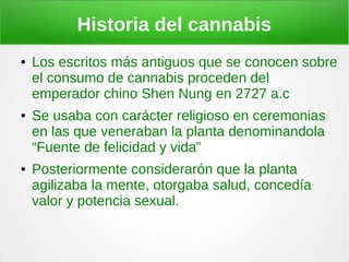 Este documento resume la historia y características del cannabis. Históricamente se usaba con fines religiosos y medicinales en China hace miles de años. Hoy en día se consume con fines recreativos, religiosos y medicinales, y contiene THC que produce efectos físicos como sequedad de garganta y efectos cerebrales como alteraciones en la consciencia y personalidad. Aunque relativamente seguro, puede tener riesgos como disminución de la concentración si se consume en exceso. España tiene altas tasas de consumo entre adolescentes y adultos jóven