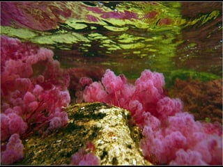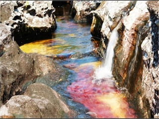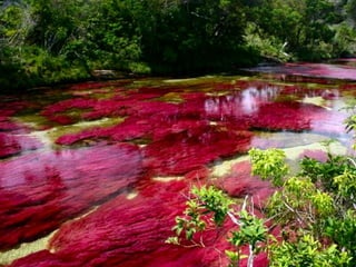El Caño Cristales en Colombia es conocido como "el río más hermoso del mundo" debido a sus vibrantes colores que van del amarillo al rojo producidos por musgos y algas. El río solo mide 100 km de largo pero destaca por sus piedras cubiertas con cinco colores diferentes. Ha sido declarado Patrimonio Biológico de la Humanidad y es mejor visitarlo en verano cuando los colores son más intensos.