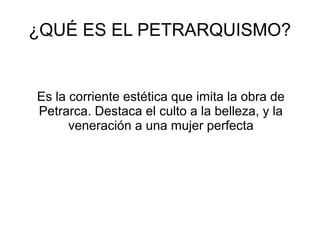 El documento habla sobre el petrarquismo, el amor cortés y el amor platónico. Explica que el petrarquismo imita la obra de Petrarca y enfatiza la belleza de la mujer amada. El amor cortés implica una veneración total de la mujer amada pero distante e inalcanzable. El amor platónico se enfoca en la belleza espiritual más que física y conduce a la contemplación de la belleza absoluta. También discute los cánones de belleza a través de la historia y características físicas y