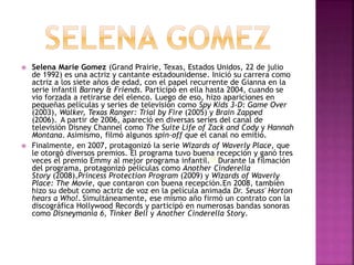 Este documento presenta información biográfica sobre cinco artistas musicales: Selena Gomez, Justin Bieber, Austin Mahone, Ariana Grande y Miley Cyrus. Detalla sus carreras como actores y cantantes, incluyendo sus roles principales, álbumes y premios.