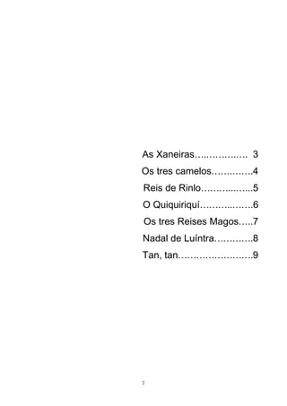 Este documento presenta 10 canciones y poemas tradicionales de Navidad en gallego. Las letras celebran la llegada de los Reyes Magos a Belén, describen a los tres camellos de los Reyes riéndose al llegar a Galicia y no encontrar desierto, e incluyen canciones infantiles como "O Quiquiriquí". La compilación fue publicada por la editorial Unitaria de Vide en noviembre de 2012 para la celebración de la Navidad.