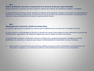 El documento describe un seminario de dos días sobre modelos de medición y compensación de fuerzas de ventas, y metodologías para la gestión de cuentas clave. El primer día se discutirán nuevos modelos de medición del rendimiento basados en principios de 'stewardship'. El segundo día, la metodología explicará cómo implementar procesos para que el equipo consultivo sea exitoso en la gestión de cuentas clave.