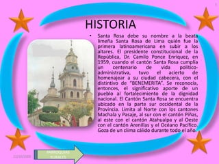 El documento proporciona información sobre el Cantón Santa Rosa en Ecuador. Se encuentra ubicado en la provincia de El Oro y limita con varios otros cantones. Describe las parroquias rurales que lo componen, incluida su ubicación, clima, principales actividades económicas y atracciones turísticas. También menciona que Santa Rosa fue nombrado "Benemérita" en 1959 en reconocimiento a su contribución a la nación.