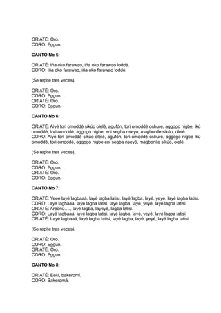 Este documento contiene 24 cantos para honrar a los ancestros (Eggun). Cada canto consiste en un Oriaté (líder) que canta una línea y un Coro que repite la línea. Los cantos tratan temas como honrar a los ancestros, la vida y la muerte.
