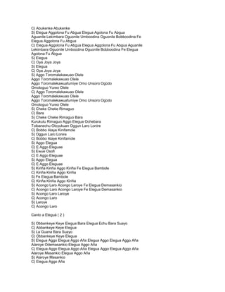 Este documento contiene varios cantos dedicados al Orisha Eleguá en lenguas africanas. Los cantos describen los orígenes de Eleguá, mencionan otros Orishas como Oggún y Olokún, e invocan a Eleguá utilizando frases rítmicas y repetitivas.