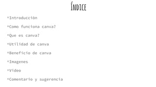 Canva es un programa en línea gratuito para diseño gráfico que permite a los usuarios crear documentos como carteles, presentaciones e infografías de manera sencilla. El documento explica cómo funciona Canva, sus utilidades que incluyen diseño profesional para principiantes, y los beneficios de herramientas como plantillas y la capacidad de agregar imágenes y texto.