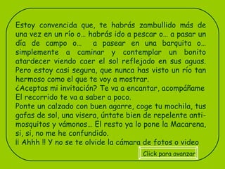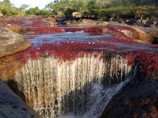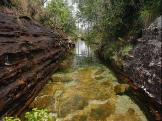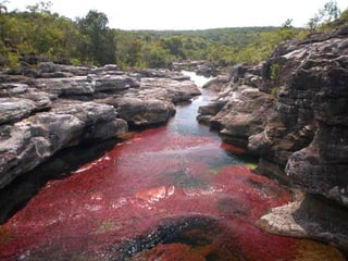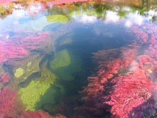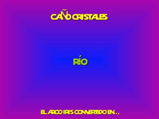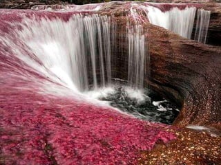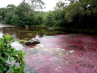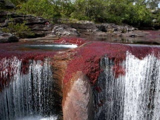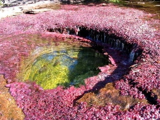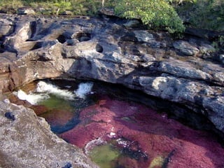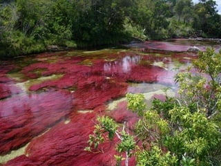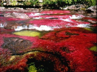El documento describe un viaje al Caño Cristales, también conocido como el río de los cinco colores, ubicado en la Sierra de la Macarena en Colombia. El río adquiere diferentes colores debido a las algas y musgos que crecen en sus aguas. El viaje comienza en Villavicencio y luego implica un vuelo a La Macarena, una navegación por el río Guayabero y una caminata por la selva hasta llegar al Caño Cristales, donde se aprecian sus aguas de diferentes colores y la abundante flora y fauna