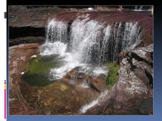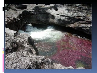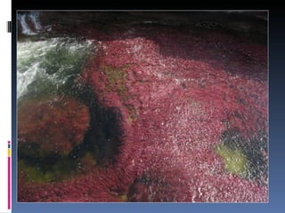 El Caño Cristales en Colombia es conocido como el río más hermoso del mundo y el río que se escapó del paraíso. Con 100 km de longitud y 20 m de ancho, el río se encuentra dentro del Parque Nacional Natural de la Macarena y toma sus vibrantes colores rojo, amarillo, azul, verde y negro de las algas y musgos que cubren sus piedras, especialmente la planta Macarenia clavijera que le da el color rojo. Fue declarado Patrimonio Biológico de la Humanidad debido a su belleza visual única