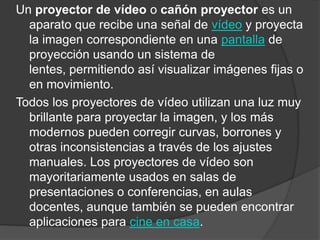 Un proyector de video proyecta una señal de video en una pantalla usando lentes. Pueden corregir inconsistencias y se usan comunmente en presentaciones y aulas. La señal puede provenir de diferentes fuentes como una TV o computadora. Existen diferentes tipos de proyectores como LCD, DLP y 3D que varían en características como resolución, brillo y contraste.