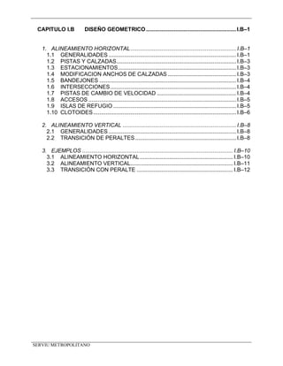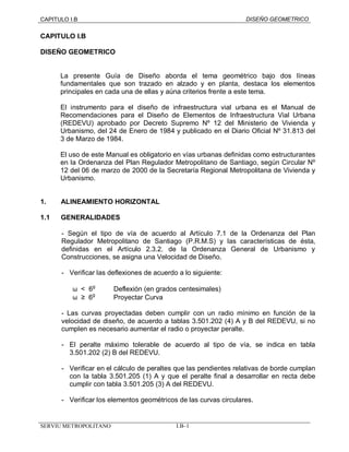 El documento describe los principales elementos geométricos que deben considerarse en el diseño de alineamientos horizontal y vertical de vías urbanas. Explica conceptos como radios mínimos, deflexiones, peraltes, clotoides y más, indicando las normas de diseño que deben seguirse según el Manual de Recomendaciones para el Diseño de Elementos de Infraestructura Vial Urbana. También aborda aspectos como anchos de calzadas, bandejones, intersecciones, islas de refugio y otros elementos asociados al diseño geométric