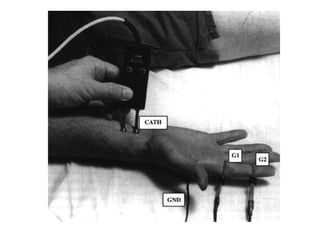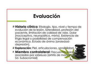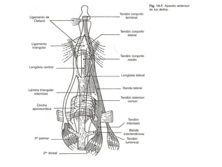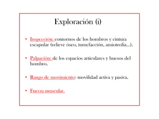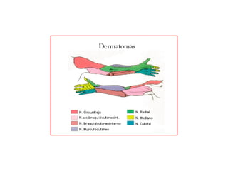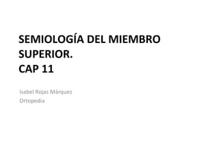 El documento trata sobre la semiología del miembro superior y la mano. Incluye la evaluación de aspectos como la inspección, palpación, pruebas funcionales y maniobras especiales para explorar estructuras como nervios, tendones y articulaciones. También describe trastornos como el síndrome del túnel carpiano, la compresión del nervio cubital y la enfermedad de Dupuytren, así como malformaciones congénitas de los dedos.