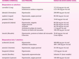 El documento describe los agonistas y antagonistas adrenérgicos. Explica que la norepinefrina y la epinefrina estimulan los receptores alfa y beta, produciendo efectos como la vasoconstricción y estimulación cardíaca. Los agonistas adrenérgicos como la dopamina y dobutamina se usan para tratar el choque, mientras que los bloqueadores adrenérgicos como los bloqueadores alfa y beta se usan para tratar la hipertensión y angina de pecho al inhibir los efectos simpáticos.
