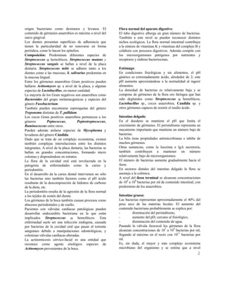 La flora humana normal coloniza las superficies cutáneo-mucosas y está compuesta de gérmenes que conviven con el huésped sin causar enfermedad. La flora se divide en flora basal, que siempre está presente en un sector, y flora transitoria, que varía entre personas. La flora oral contiene diversas especies de Streptococcus y contribuye a enfermedades como caries y periodontitis. La flora intestinal aumenta en complejidad y cantidad hacia el colon, donde hay más de 500 especies bacterianas y contribuye a funciones como la