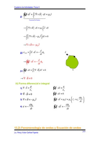 Este documento resume las ecuaciones de Maxwell y las ondas electromagnéticas. (1) Presenta las ecuaciones de Maxwell en forma integral y diferencial. (2) Explica la fenomenología de las ondas electromagnéticas planas viajeras y la ecuación de ondas. (3) Describe la densidad y flujo de energía en las ondas electromagnéticas.