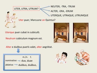 El documento presenta una lección sobre la gramática latina. Introduce varios temas gramaticales como los pronombres "uter", "neuter" y "alter", los casos del dativo como el dativo de interés con "mecum" y "tecum", las declinaciones del participio presente, y el uso del verbo "inquit" para introducir discurso directo. Explica conceptos como el número verbal cuando los sujetos son personas u objetos, y el uso de la preposición "praeter" con acusativo.