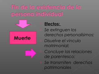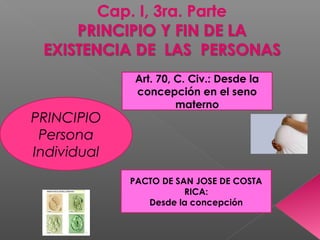 Este documento discute varios artículos relacionados con el comienzo y fin de la existencia legal de personas. Indica que la persona comienza desde la concepción según el Artículo 70 del Código Civil y el Pacto de San José de Costa Rica. También explica que las personas jurídicas comienzan desde el día en que son autorizadas por la ley o el gobierno y confirman sus estatutos y la autoridad religiosa de acuerdo con el Artículo 45. Finalmente, detalla algunas formas en que termina la existencia legal de personas jur