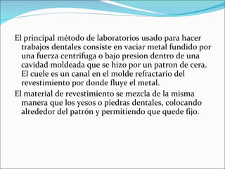El documento describe los principales métodos y materiales utilizados para hacer trabajos dentales, incluyendo vaciados de metal fundido en moldes de yeso u otros materiales refractarios. Describe los tipos de revestimientos utilizados, como la cristobalita y el fosfato, y sus propiedades como la expansión térmica y la pureza. También cubre aspectos como el tiempo de fraguado y la eliminación del aire durante el proceso de vaciado.