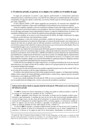 Este documento describe la crisis financiera que afectó al subsector privado de atención médica en Argentina desde mediados de la década de 1990. La crisis se debió a varios factores como cambios en los modelos de pago que trasladaron más riesgo económico a los prestadores, retrasos y quitas en los pagos de las obras sociales, y un sobredimensionamiento en la oferta privada. Como resultado, muchos efectores privados sufrieron incumplimientos de pagos, cierres e incluso quiebras. El documento analiza las