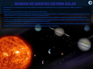 El documento proporciona información sobre los planetas del sistema solar, con especial atención a Marte y Saturno. Describe las características físicas de cada planeta como su masa, radio, distancia al sol, periodos de rotación y revolución, inclinaciones, lunas y anillos. Explica las condiciones extremas en Mercurio y Venus, y señala que Marte presenta un registro geológico completo con estructuras como el Valle Marineris y los casquetes polares formados por hielo de CO2 y posiblemente ag