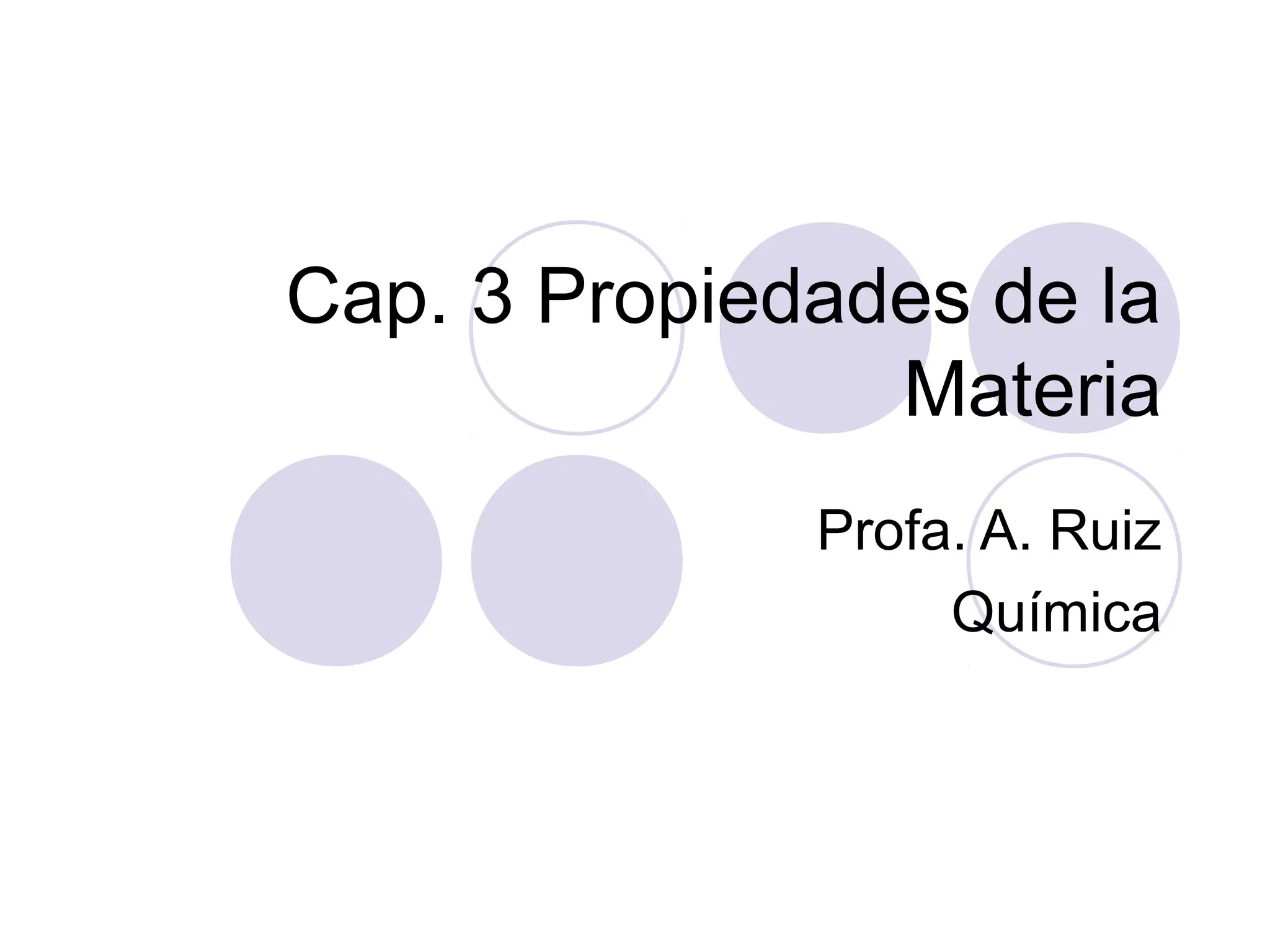 Este documento resume las propiedades de la materia, incluyendo que una sustancia tiene una composición uniforme, las propiedades físicas y químicas, y los tres estados comunes de la materia (sólido, líquido y gas). También explica la diferencia entre cambios físicos y químicos, y la ley de conservación de masa en las reacciones químicas.