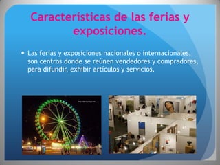 Este documento describe las características y funciones clave de las ferias y exposiciones desde la perspectiva de los organizadores y expositores. Explica que las ferias y exposiciones reúnen vendedores y compradores para mostrar productos y servicios, y que las ferias también incluyen entretenimiento. Además, detalla las funciones principales de los organizadores como definir el presupuesto, seleccionar ubicaciones y materiales, e implementar estrategias de mercadeo. Finalmente, explica que el éxito para los expositores se mide