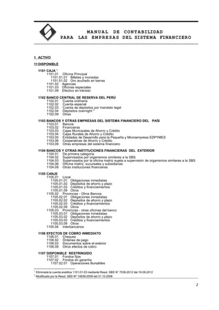 Este documento presenta el catálogo de cuentas para la contabilidad de empresas del sistema financiero. Describe las cuentas de activo, incluyendo disponible, fondos interbancarios, inversiones negociables y a vencimiento, e inversiones disponibles para la venta. Se dividen estas cuentas en subcuentas específicas para diferentes tipos de valores y títulos, como acciones, bonos y otros instrumentos financieros emitidos por bancos, empresas de seguros y otras sociedades.