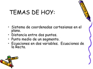 Este documento presenta conceptos básicos de coordenadas cartesianas como sistema para representar puntos en un plano, incluyendo cuadrantes, abscisas y ordenadas. También introduce la distancia entre puntos, el punto medio de un segmento, ecuaciones en dos variables y algunos ejemplos de ecuaciones de rectas, circunferencias, parábolas, elipses y funciones.