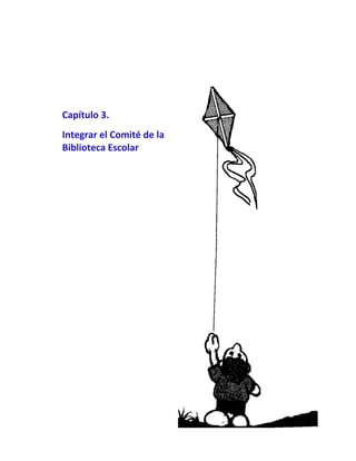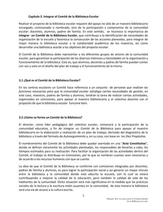 Este documento describe cómo formar y funcionar un Comité de Biblioteca Escolar. Explica que el Comité debe representar a los diferentes grupos de la comunidad escolar para garantizar la participación de todos. Detalla cómo se forma el Comité a través de una convocatoria del director y la creación de una "Acta Constitutiva" que defina las actividades, responsabilidades y comisiones. Finalmente, explica que las funciones del Comité incluyen apoyar al maestro bibliotecario, mejorar la organización escolar, y alcanzar los objetivos del plan de