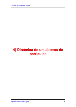 Este documento presenta un resumen de los conceptos fundamentales de dinámica de sistemas de partículas. Explica la cantidad de movimiento lineal y angular de un sistema de partículas, así como el centro de masa y su relación con la dinámica del sistema. También introduce conceptos como el impulso de una fuerza, energía cinética y potencial de un sistema, y aplicaciones importantes como el estudio de choques y colisiones.