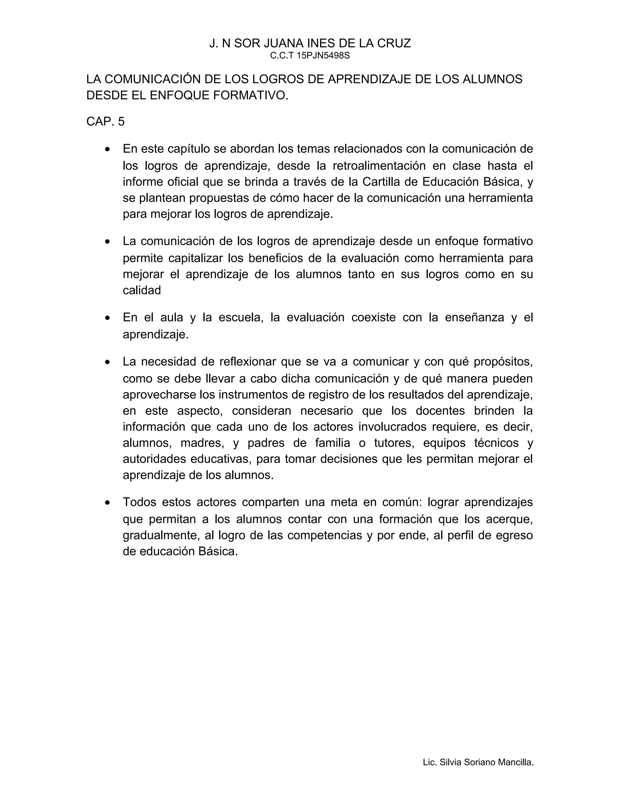 El capítulo aborda la comunicación de los logros de aprendizaje de los alumnos desde un enfoque formativo, incluyendo la retroalimentación en clase y los informes oficiales. Se argumenta que la comunicación debe usarse como una herramienta para mejorar el aprendizaje brindando información relevante a alumnos, padres y autoridades. Además, la evaluación debe integrarse con la enseñanza y el aprendizaje para lograr las competencias requeridas.