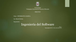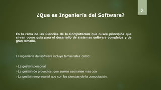Este documento proporciona una introducción a la ingeniería de software. Define la ingeniería de software como la rama de la ciencia de la computación que busca principios para guiar el desarrollo de sistemas de software complejos y grandes. Explica conceptos clave como el ciclo de vida del software, metodologías como el modelo en cascada e iterativo, y temas como la modularidad, UML, patrones de diseño y documentación. También cubre consideraciones legales como la propiedad del software y las licencias.